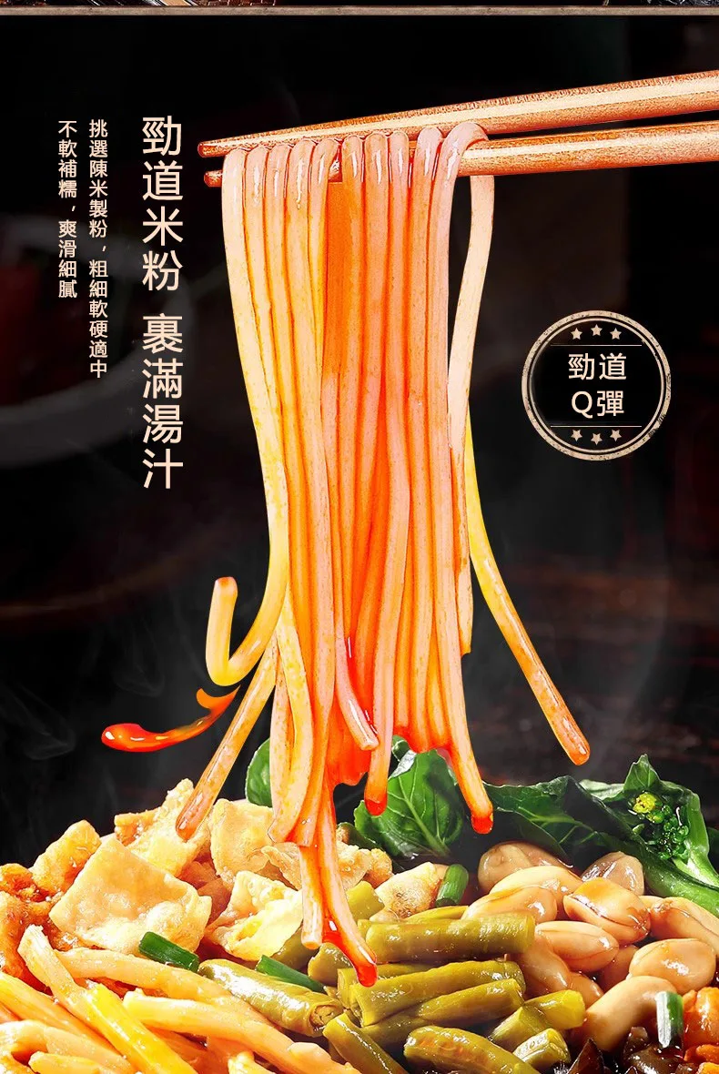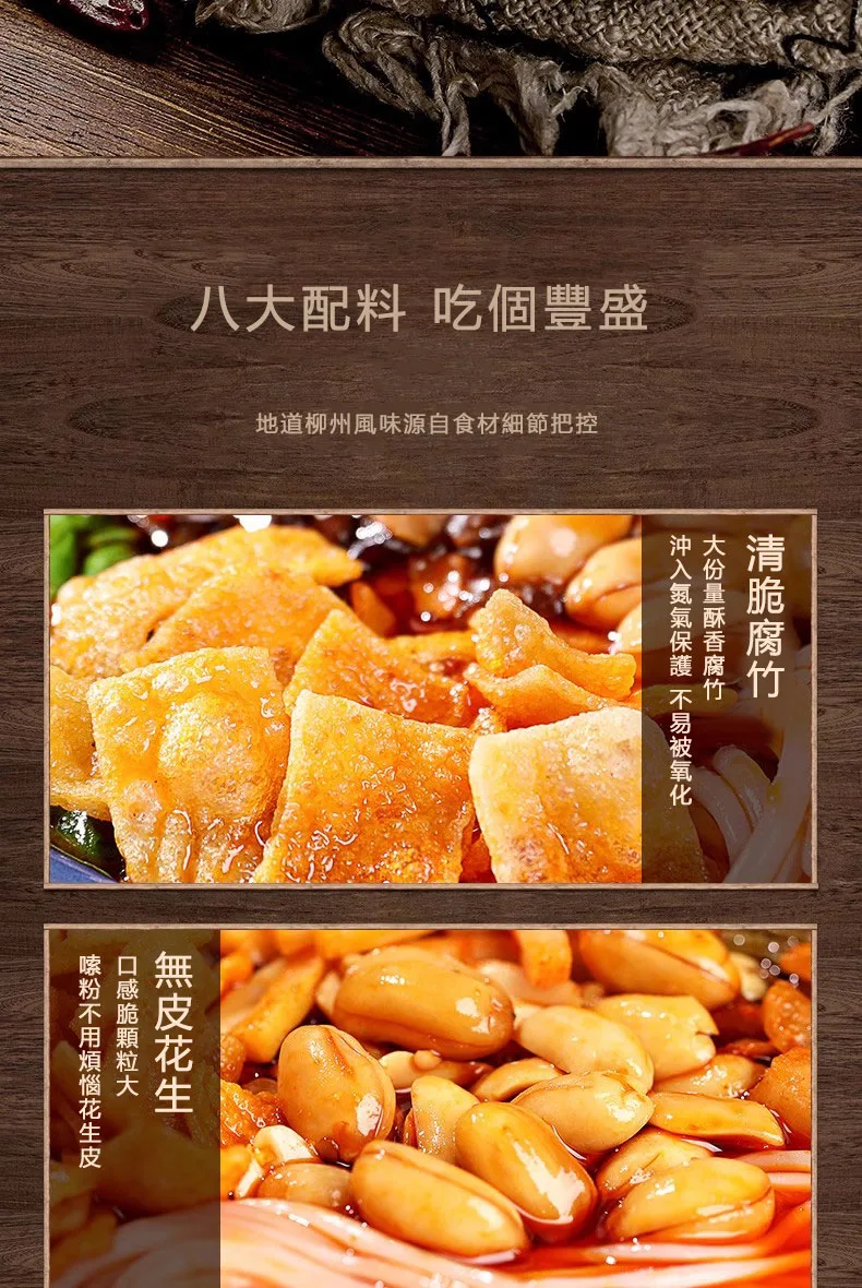 1. 乾米粉包:以陳米製作米粉,是道地柳州螺螄粉的特色之一。相較於新米,陳米的油脂與膠質更低,經恆溫乾燥製成的米粉,口感 Q 彈滑順、細緻有勁道!