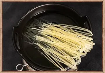 Step 1:將米粉冷水下鍋煮至滾沸,再轉中火煮約 8 分鐘,撈起備用;